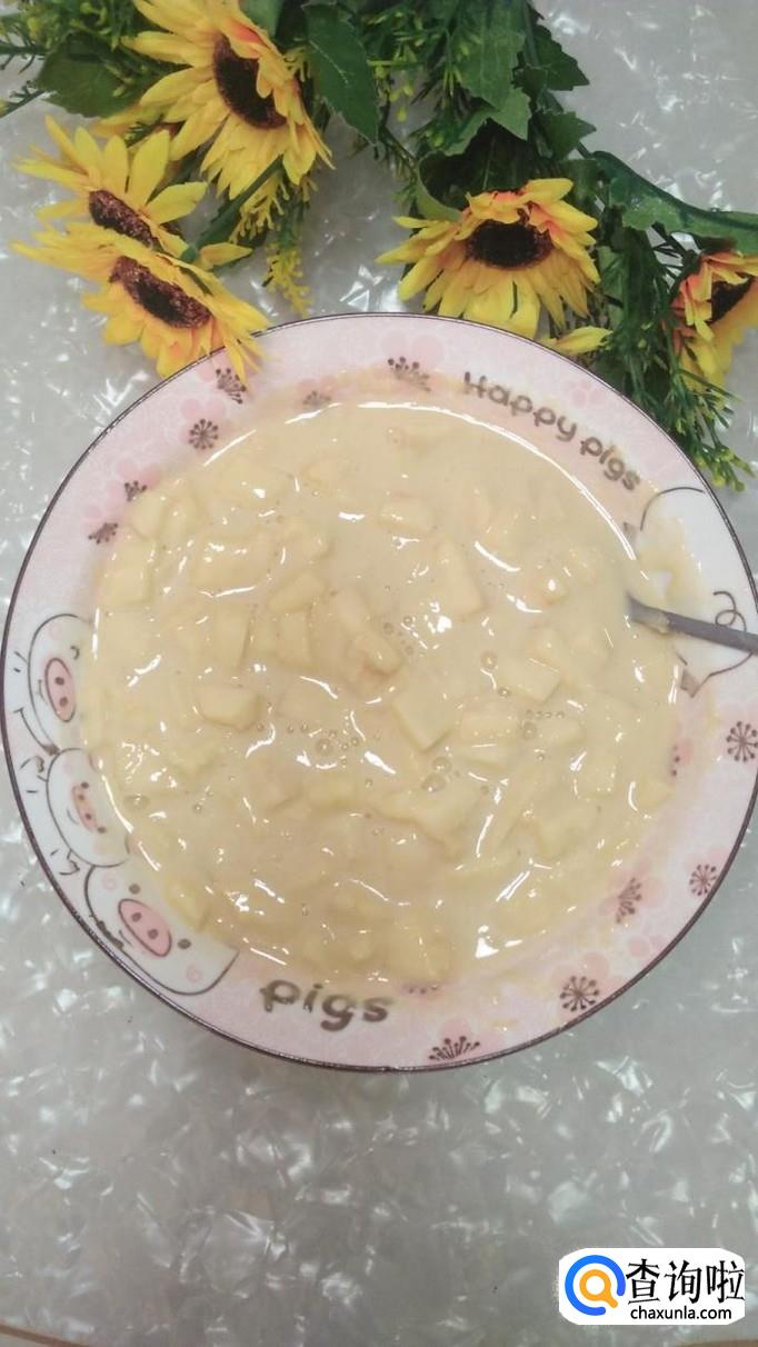 倒入半袋纯牛奶,搅拌成稀糊状,比酸奶状稍微稠一些,这样可以将苹果小丁儿粘连在一起。