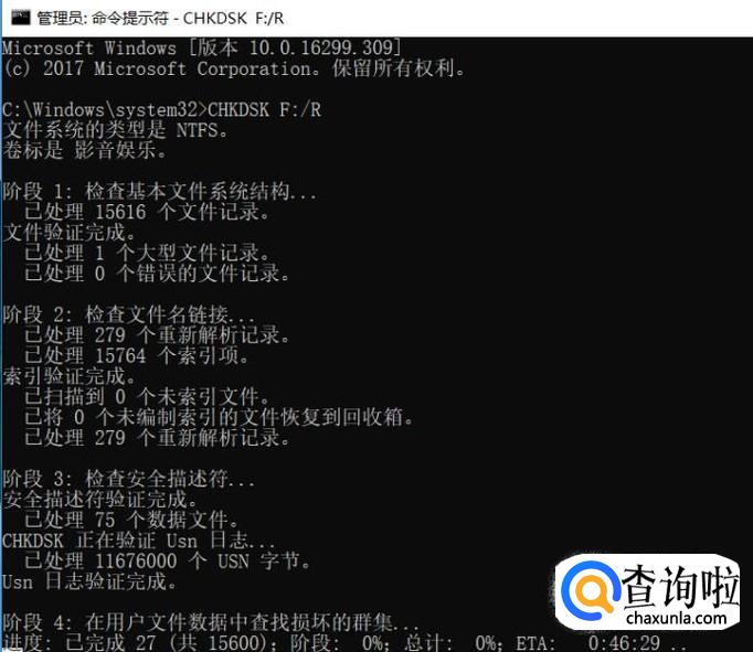 接下来,等待磁盘的修复过程,视磁盘的分区大小以及文件的多少来确定所需要的时间,一般来说时间都在半个小时以上。