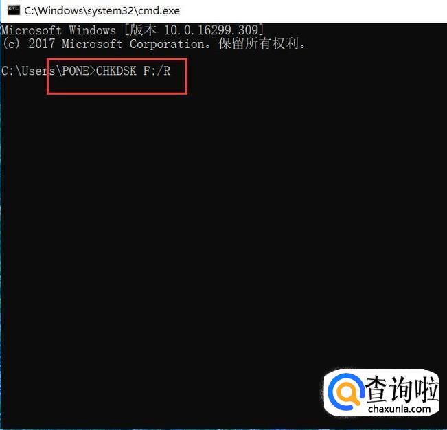 接下来,在打开的命令行窗口页面中,输入“CHKDSK X:/R”命令,查看该磁盘分区是否存在错误。“X”代表的是出现错误的那个分区。