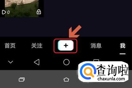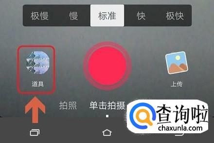返回到抖音APP首页以后,我们点击页面最下方的“+”,这样就切换到了视频拍摄界面,在该页面的左下角点击“道具”这一项;