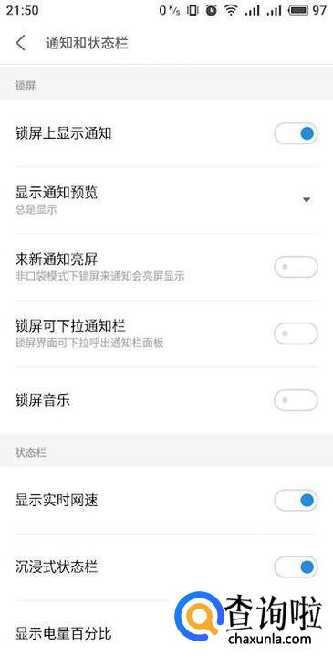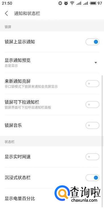 进入通知和状态栏设置界面,在下方状态栏中我们能够看到“显示实时网速”选项。