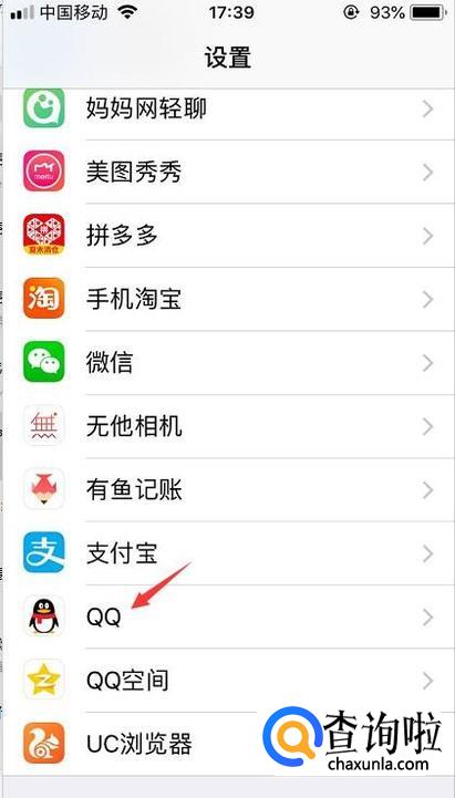 然后在设置里面一直往下拉,知道看到qq的应用就点击进去。