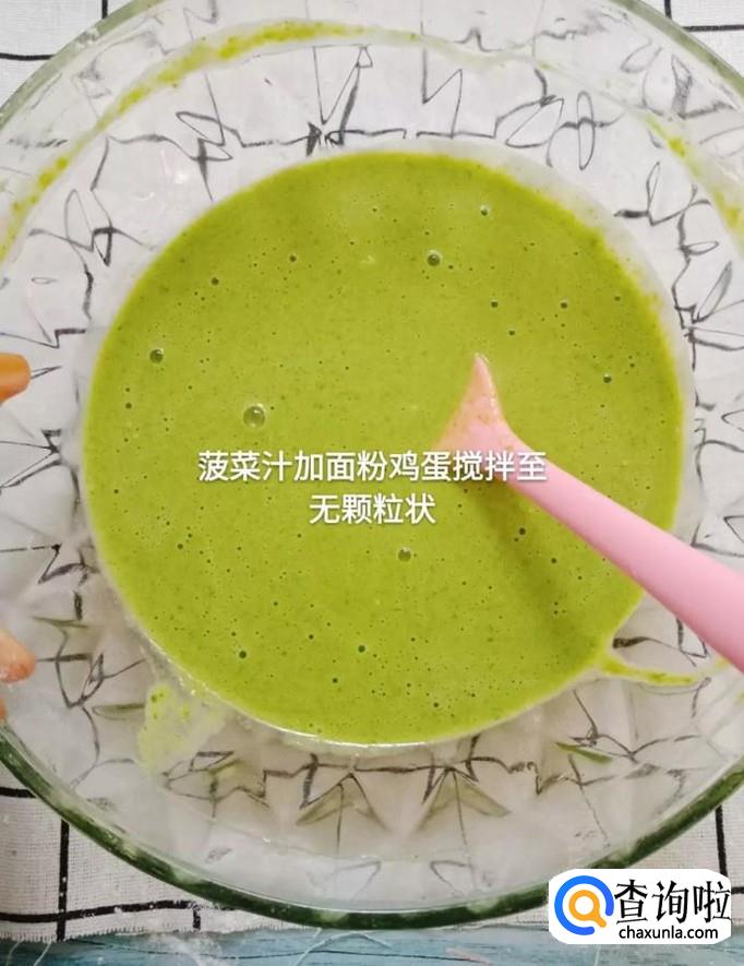 然后在菠菜汁中加入面粉和鸡蛋,搅拌至无颗粒状,如下图所示。