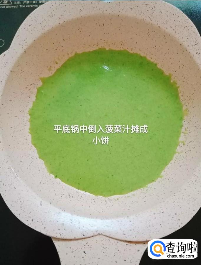接着在平底锅中加入适量的食用油,待油冒烟,倒入菠菜汁摊成小饼,如下图所示。