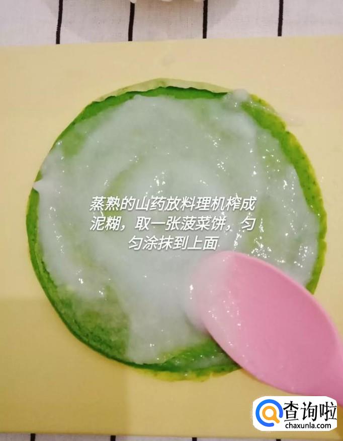 接着把蒸熟的山药放入料理机中打成泥,之后均匀的涂抹在菠菜饼上,如下图所示。
