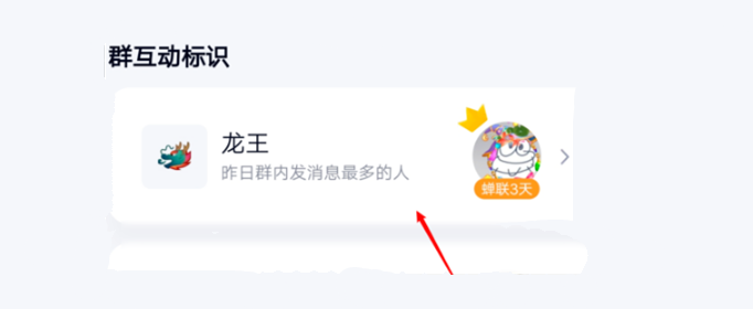 QQV8.2.6版本新增了一个可以在群聊里面的互动群标识,只要有人在群内踊跃发言,那么这个绿色的龙王标识就会加到他的头上,意指昨日在群内发言最多的人。