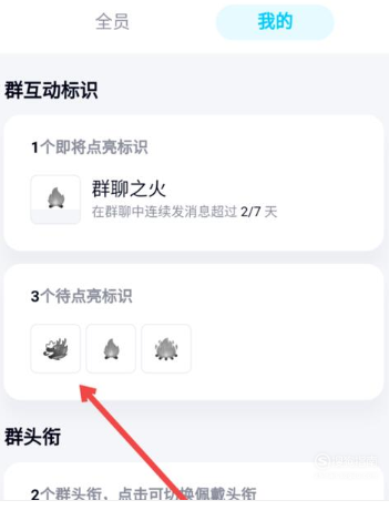 5、点击上方“我的”页面,在群互动标识下,可以看到待点亮的标识中,是否有龙王”标识。