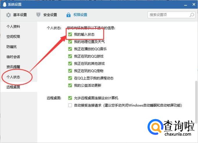 在右侧“个人状态”设置信息里,可以看到一个“我的输入状态”选项,若是将此选项前面打上对勾即可将“对方正在输入”打开,反之,则将其关闭,如图所示。