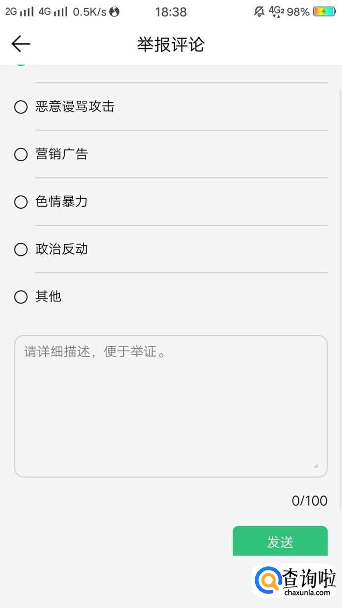 进入之后,填写举报的原因,点击“发送”即可,如图所示。