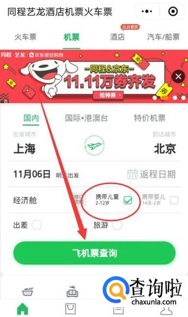 进入之后,填写出行信息,勾选“携带儿童”,点击“飞机票查询”,如图所示。