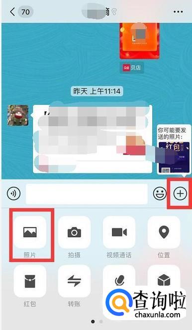 接着打开微信好友聊天窗口,点击右下角+这个符号,再点击照片。