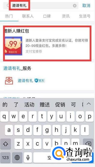 然后在搜索框中输入邀请有礼,再点击邀请新人赚红包。
