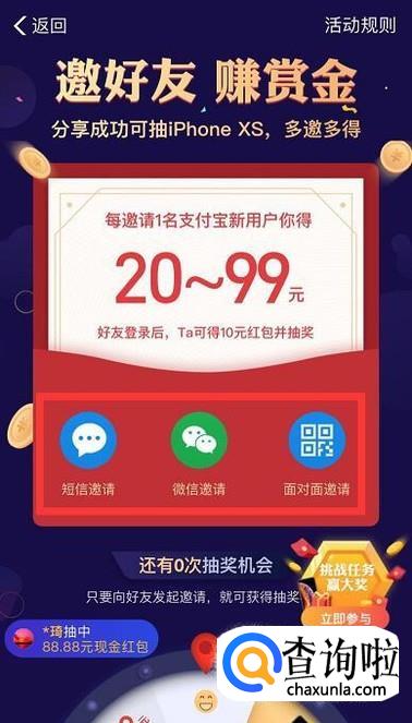 邀请支付宝新用户赚赏金,首先打开支付宝首页,点击上方搜索框,输入邀请有礼,然后点击邀新人赚赏金,再点击微信邀请,接着点击去微信分享,最后把带有二维码的照片发分享给好友即可。好友同意邀请加入支付宝后,你就可以获得一定的赏金。