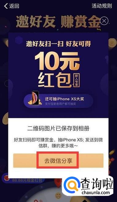 系统会把二维码照片保存到手机相册里,然后点击去微信分享。