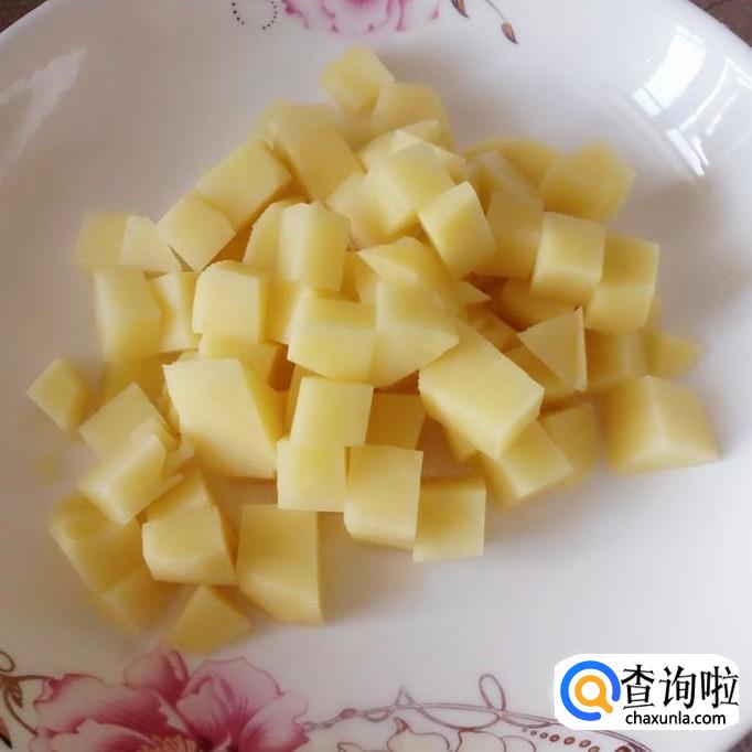 土豆去皮,洗净,切成小方块,放入盘中备用,土豆的营养价值很高,经常吃土豆还可以减肥呢。