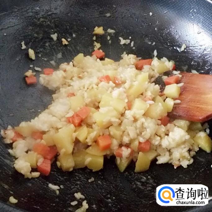 剩米饭适量,土豆,胡萝卜,葱,姜,鸡肉适量,咖喱块适量。