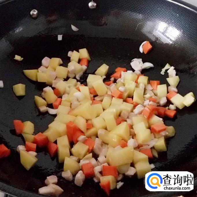 放入土豆中火煸炒,放入胡萝卜煸炒,炒大约2分钟左右。