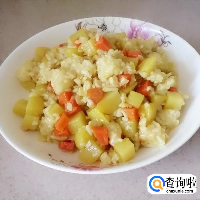 咖喱融化开,放入米饭,中火翻炒,翻炒2分钟左右,出锅装盘,咖喱饭就做好了。