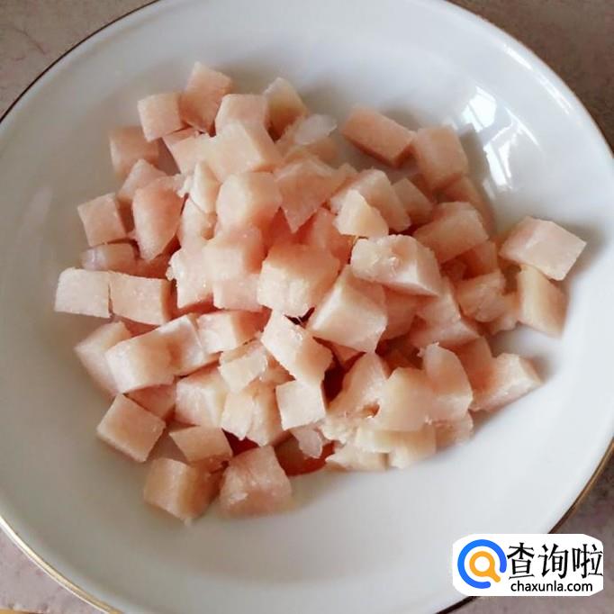 鸡肉选择鸡胸脯肉,洗净切成小块,放入碗中备用,葱洗净切成丁,姜洗净切成丁备用。