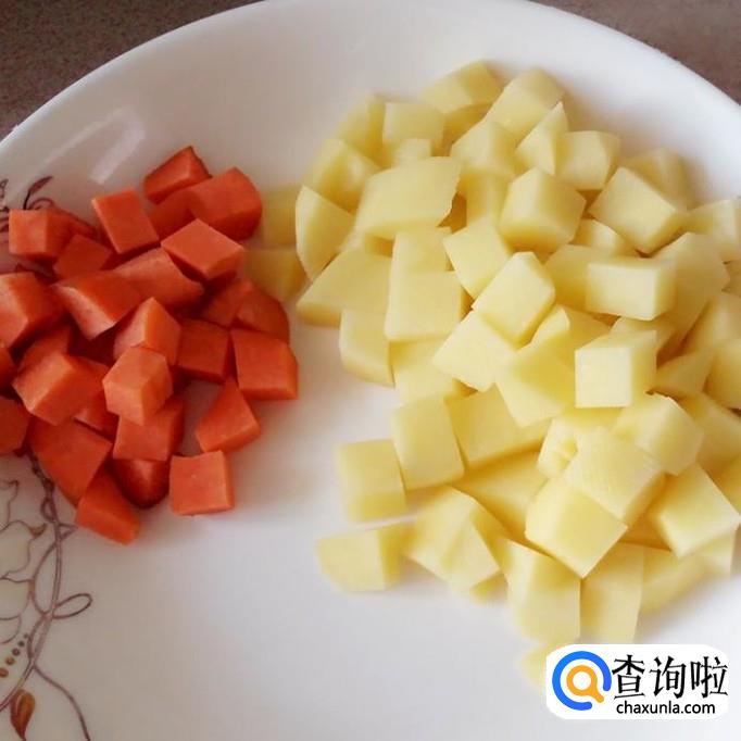 胡萝卜一根,洗净,去皮,切成小方块,和土豆块大小一样,胡萝卜含有对眼睛有好处的物质,对于电脑族,手机族可以经常吃一些胡萝卜。