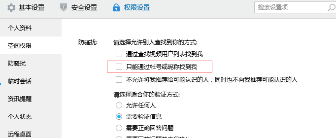 我们通常了为了防止广告QQ恶意加好友,我们会开启QQ账号查找功能,在qq设置-权限设置-防骚扰中,勾选“只能通过账号或昵称找到我”打开该功能。