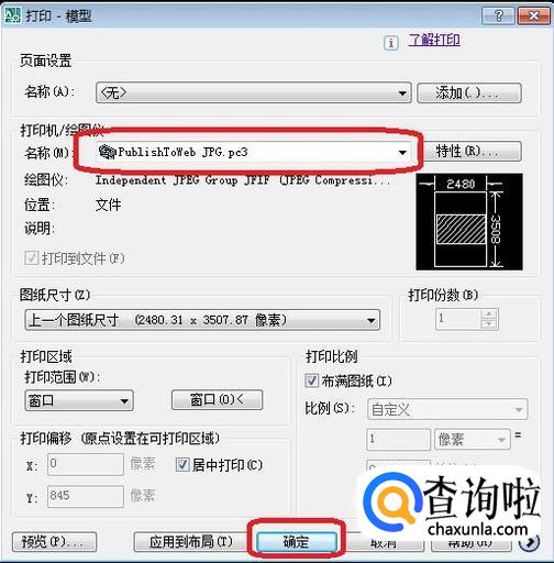 在打印选项框中,如图所示选择打印机名称(该形式能把CAD输出为JPG格式),尽量选像素高一点的选项。其他设置完成以后,点击“确定”。
