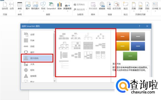 在弹出的窗口中选择“层次结构”,在右边选择合适的结构图,点击确认。