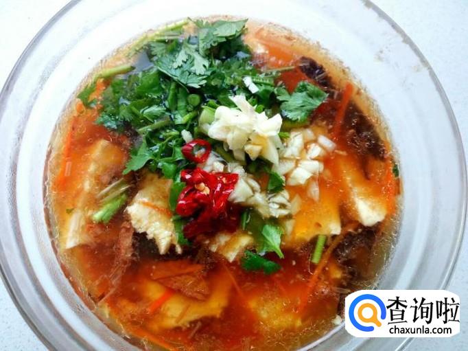 按照食用量把做好的豆腐脑盛入碗中,放入香菜末,蒜末,辣椒油,就可以了。