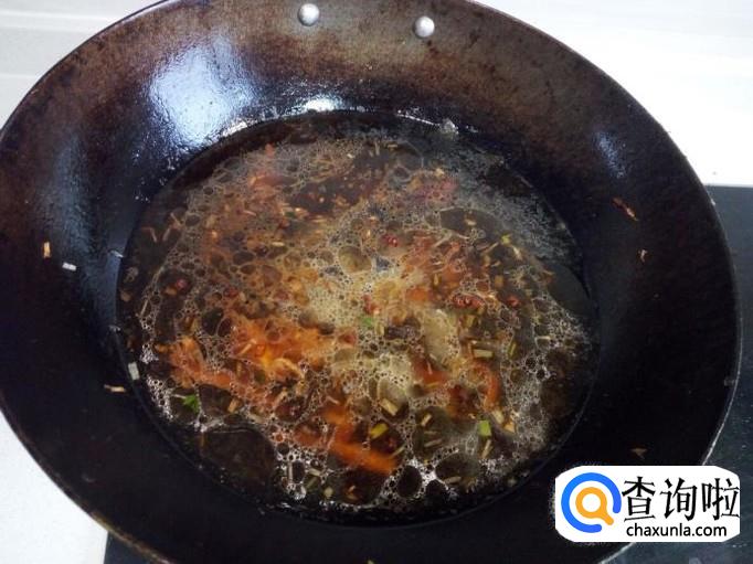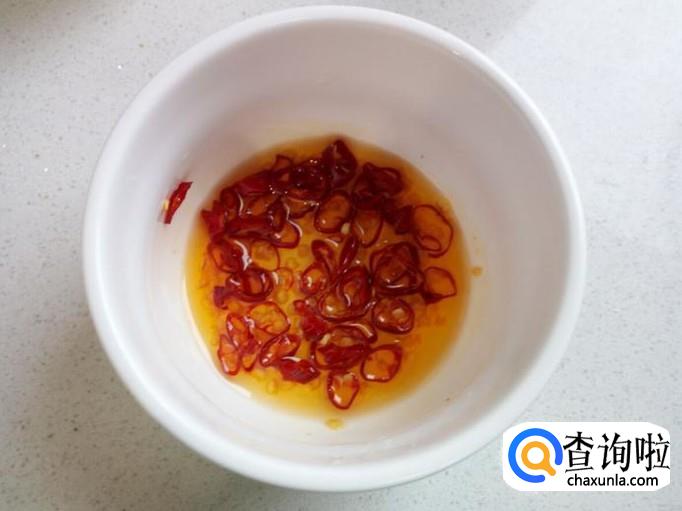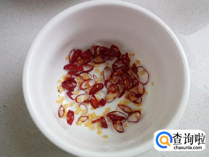 锅内放入稍多一些的油加热,油热后用勺盛出一部分油(少量),浇到切好的红干椒丝上,炸成辣椒油。