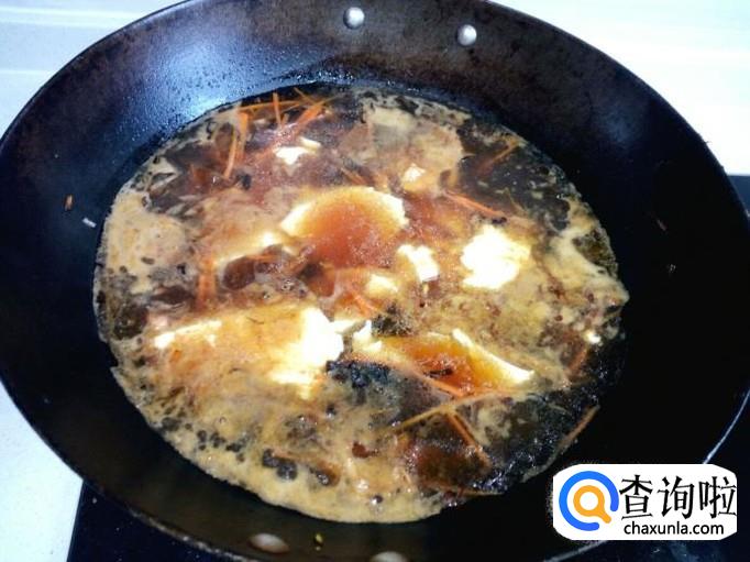 水开后,把勾兑好的芡汁倒入锅中,用勺搅拌粘稠后,用匙儿分次把内酯豆腐下入锅中。
