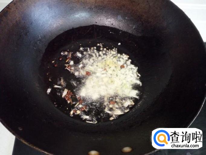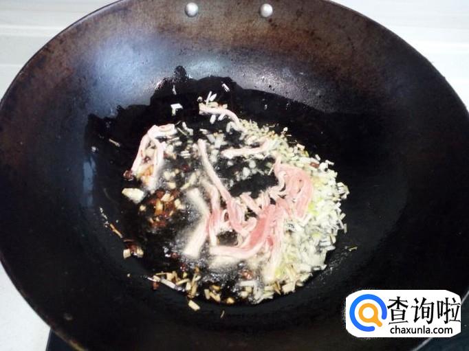 然后锅内放入花椒,葱,姜,蒜(蒜留一部分待用)爆锅,放入肉丝翻炒。