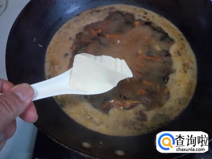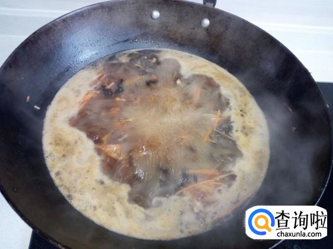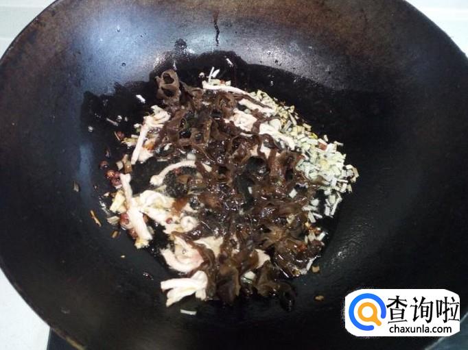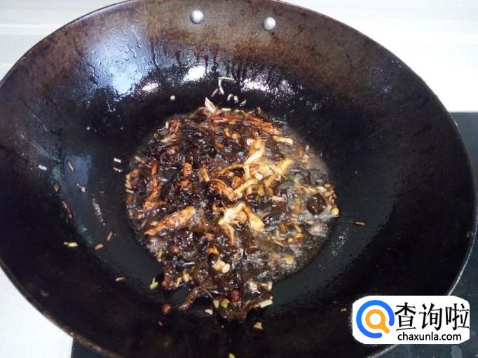 肉丝略翻炒一下,放入木耳翻炒,放入料酒,酱油,盐。然后放入少半锅水(放水量根据个人喜好掌握,我比较喜欢汤汁多一些),放入胡萝卜丝,大火烧开。