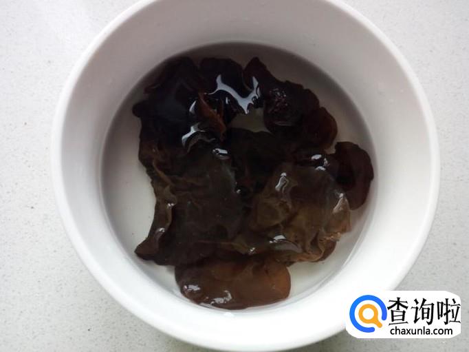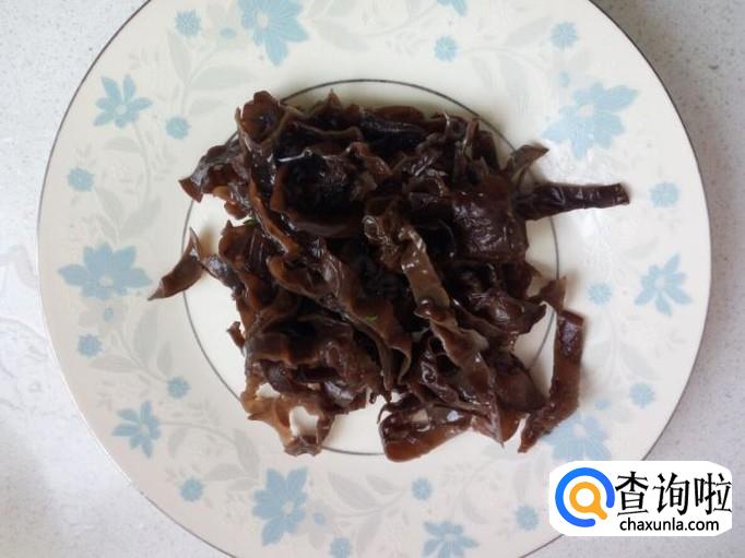 用温水快速泡发木耳。把泡发好的木耳收拾清洗干净,控干水分,切成丝,备用。