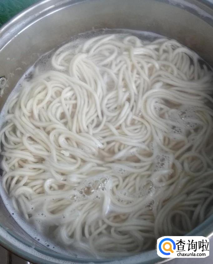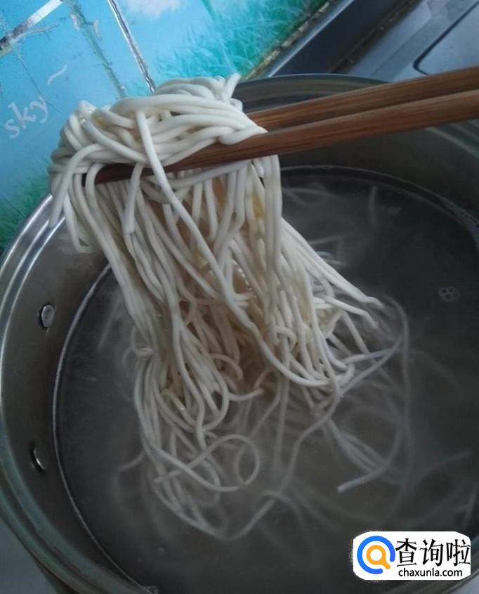 将挂面倒入沸腾的热水中,分三次泼凉水,煮熟。