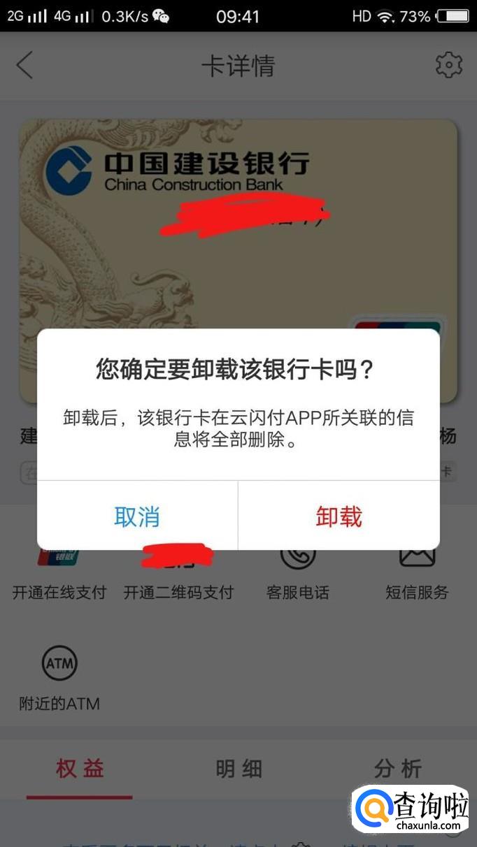 点击”卸载卡片“会弹出一个页面,如图,点击卸载即可完成解绑银行卡。