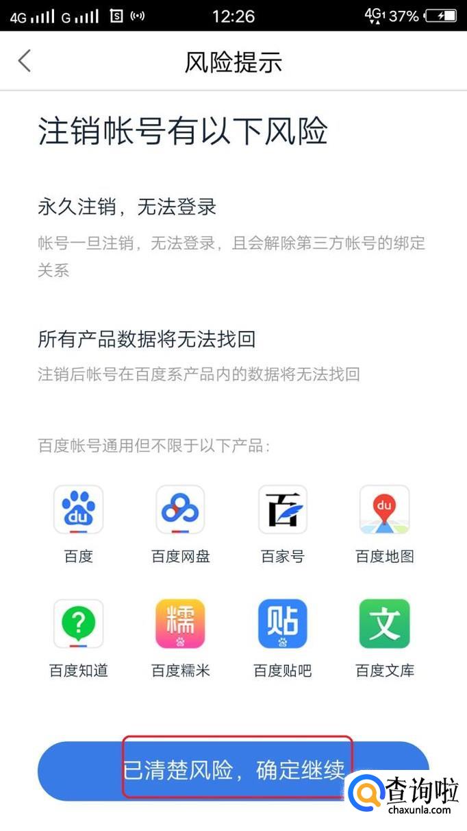 接着就能看到风险提示了,阅读完毕,点击“确定继续”,按步骤操作就可以了。注销账号之前,必须保证账户里没有余额哦!