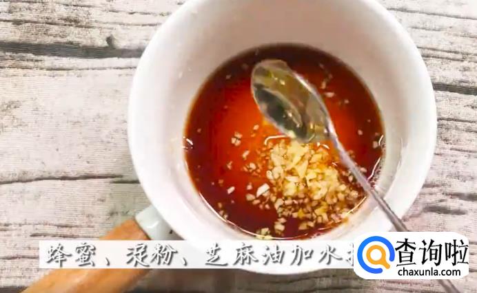 取一个干净的碗,做酱汁:放入柠檬汁、生抽、盐、姜蒜末、蜂蜜、淀粉、芝麻油和水搅匀。