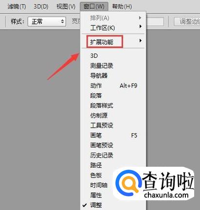 打开ps之后我们找到窗口里的扩展功能选项,没如图所示: