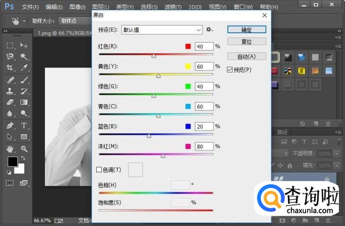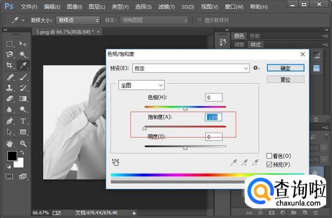 第二种方法就是通过调整色相/饱和度,来实现把彩色图片变为黑白的目的。我们只需要把饱和度的数值调整为最小就可以了。