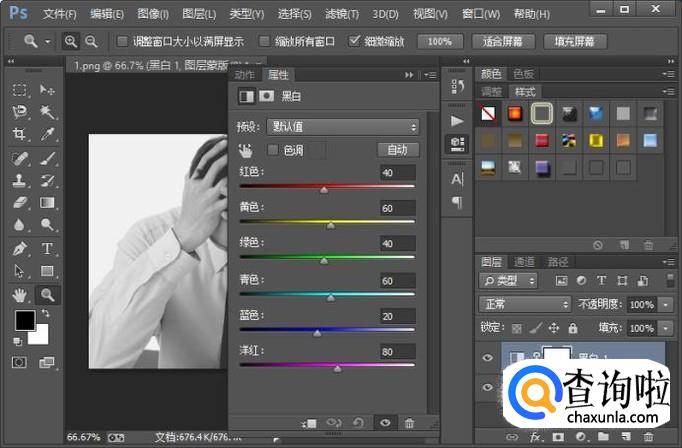 第五种方法就是给图片添加一个黑白调整图层。这种方法跟执行图像-调整-黑白的原理是一样的。