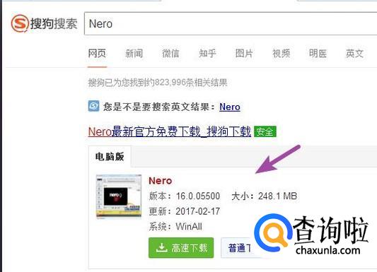搜狗搜索到Nero刻录软件,下载并完成解压和安装,如图
