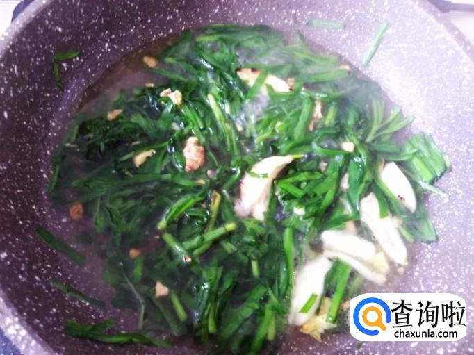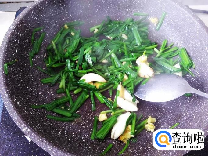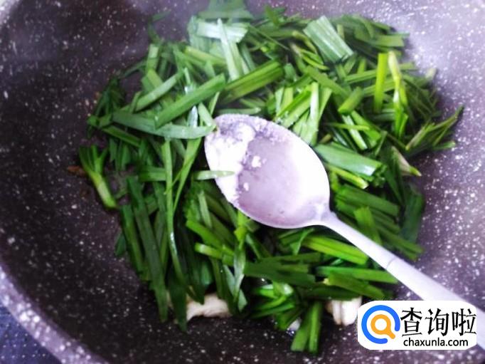 韭菜下锅,加适量的盐翻炒一下,然后下小半碗水。