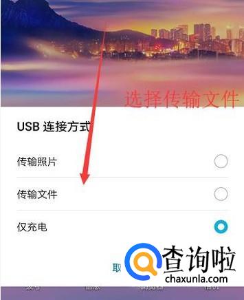 首先大家要准备一根数据线,用数据线将手机和电脑连接起来,然后手机就会提示选择的传输类型,这里选择传输文件
