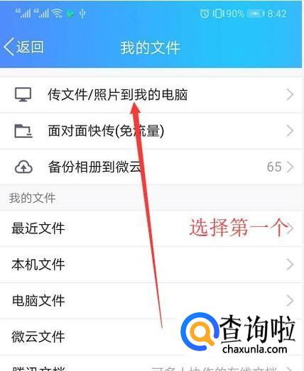 然后选择传文件/照片到我的电脑,如下图所示