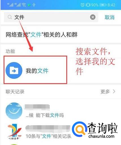 首先打开QQ,在顶部的搜索框输入文件,点击我的文件选项,如下图所示