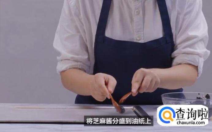 将芝麻酱分盛到油纸上,放入冰箱冷冻半小时,让它更结实,更方便包裹。