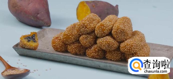 红心番薯350g、糯米粉30g、澄粉15g、白砂糖适量、猪油2勺、黑芝麻酱300g、芝麻油适量、白芝麻适量、调和油适量