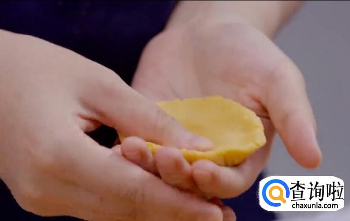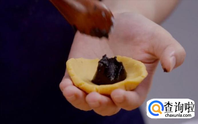 取一枚剂子,压成圆饼后,放一枚芝麻馅在中央。