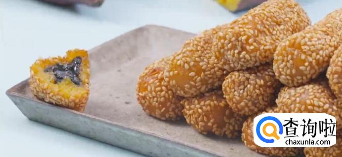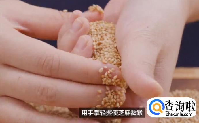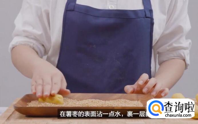 在薯枣的表面沾一点水,裹上一层白芝麻。