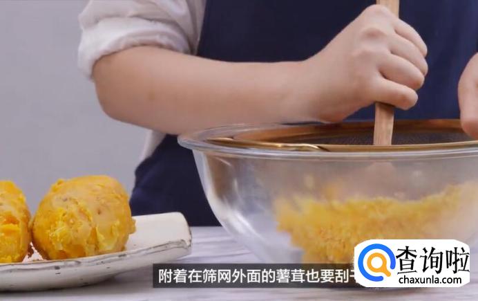 蒸好后去除皮,放在筛网上,用木勺压碎,附着在筛网外面的薯茸也要刮干净。